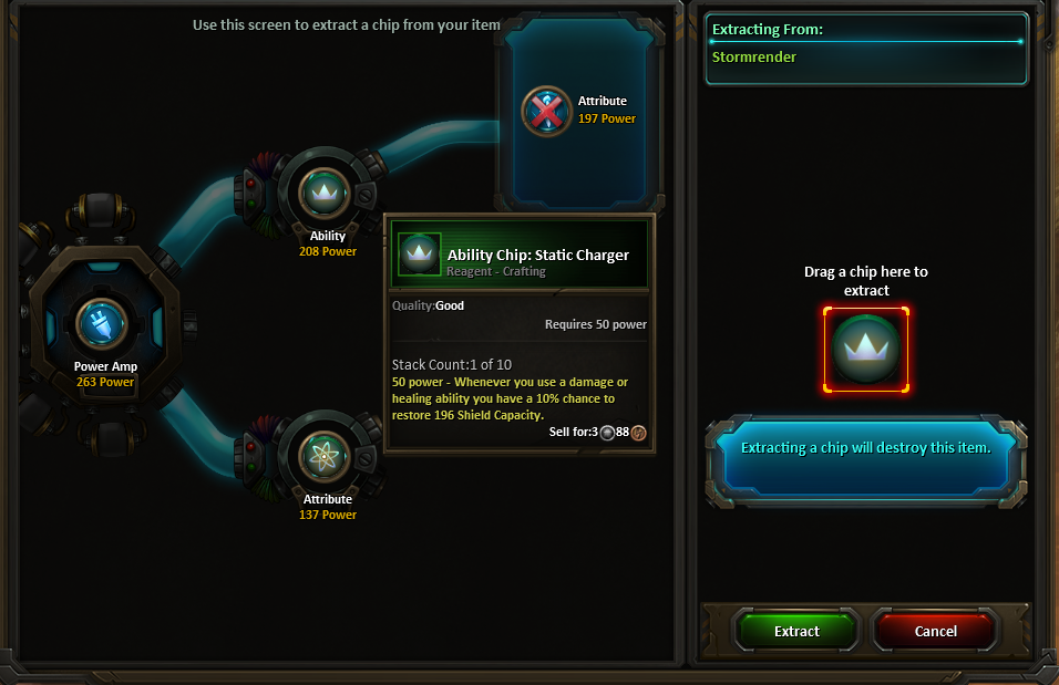 Each item will have a power core that will be based on its level. This core will generate energy that is used to power microchips that alter the item. There are three primary types of chips: Power Amps, Attribute Relays, and Special Circuits (Which in turn come in three primary types: Ability Chips, Set Chips, and Item Challenge Chips)